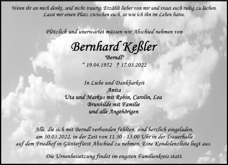 Hier finden Sie alle Traueranzeigen aus der Zeitung, die bisher für Barnhard Keßler erschienen sind. Weitere Traueranzeigen, die in der Zeitung erscheinen, werden hier ebenfalls aufgelistet