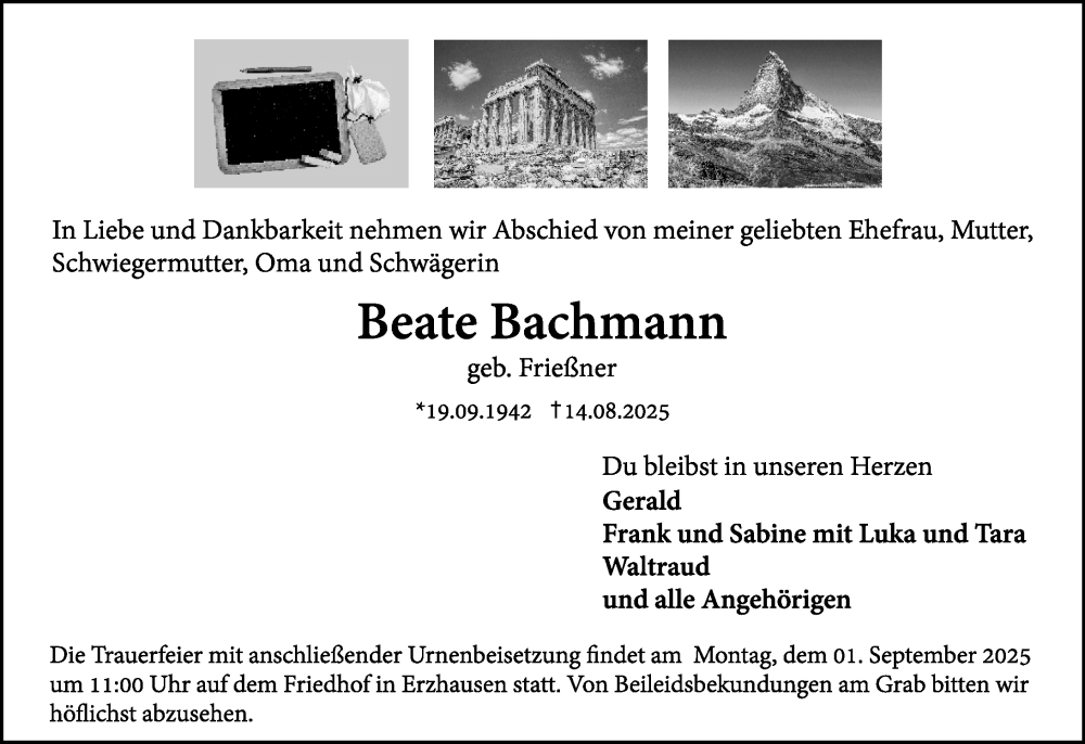 Hier finden Sie alle Traueranzeigen aus der Zeitung, die bisher für Beate Bachmann erschienen sind. Weitere Traueranzeigen, die in der Zeitung erscheinen, werden hier ebenfalls aufgelistet