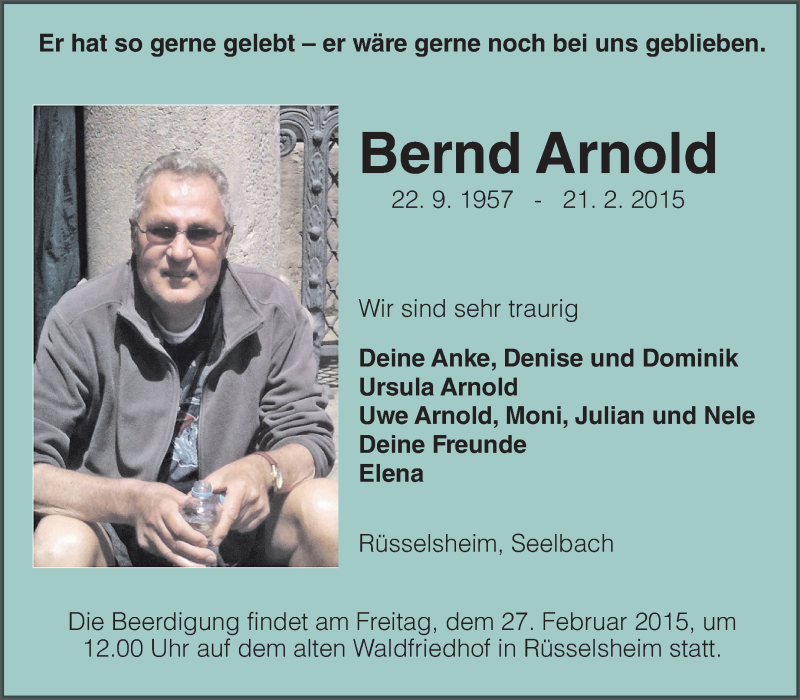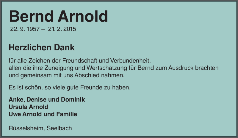 Hier finden Sie alle Traueranzeigen aus der Zeitung, die bisher für Bernd Arnold erschienen sind. Weitere Traueranzeigen, die in der Zeitung erscheinen, werden hier ebenfalls aufgelistet