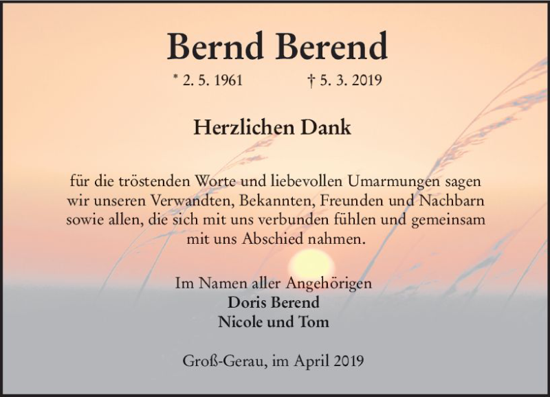 Hier finden Sie alle Traueranzeigen aus der Zeitung, die bisher für Bernd Berend erschienen sind. Weitere Traueranzeigen, die in der Zeitung erscheinen, werden hier ebenfalls aufgelistet