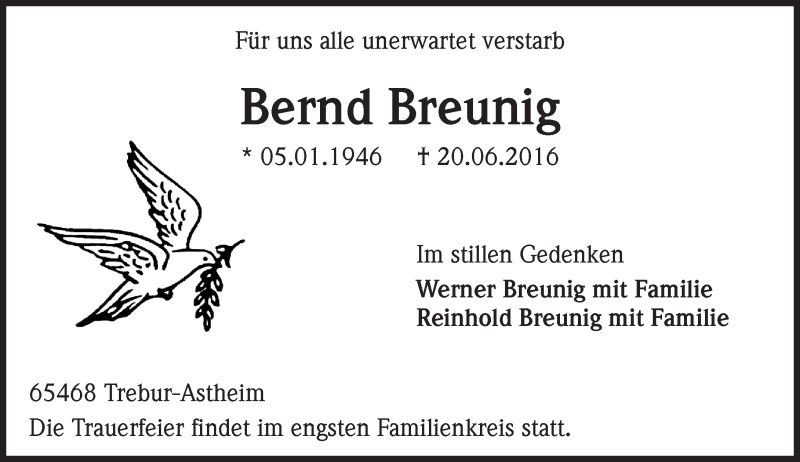 Hier finden Sie alle Traueranzeigen aus der Zeitung, die bisher für Bernd Breunig erschienen sind. Weitere Traueranzeigen, die in der Zeitung erscheinen, werden hier ebenfalls aufgelistet