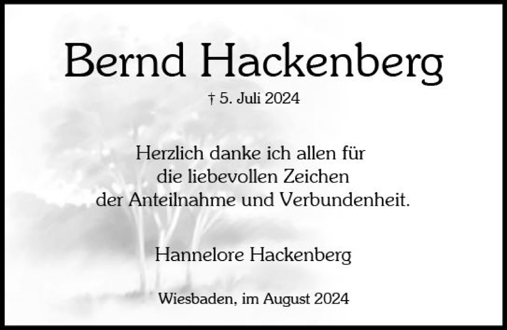 Hier finden Sie alle Traueranzeigen aus der Zeitung, die bisher für Bernd Hackenberg erschienen sind. Weitere Traueranzeigen, die in der Zeitung erscheinen, werden hier ebenfalls aufgelistet