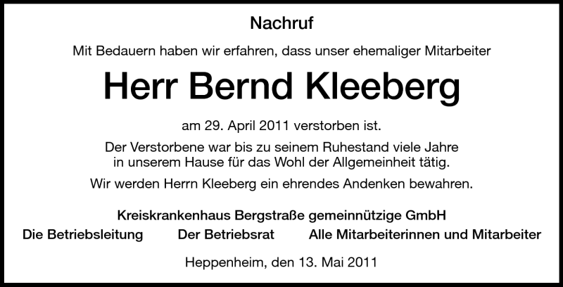 Hier finden Sie alle Traueranzeigen aus der Zeitung, die bisher für Bernd Kleeberg erschienen sind. Weitere Traueranzeigen, die in der Zeitung erscheinen, werden hier ebenfalls aufgelistet