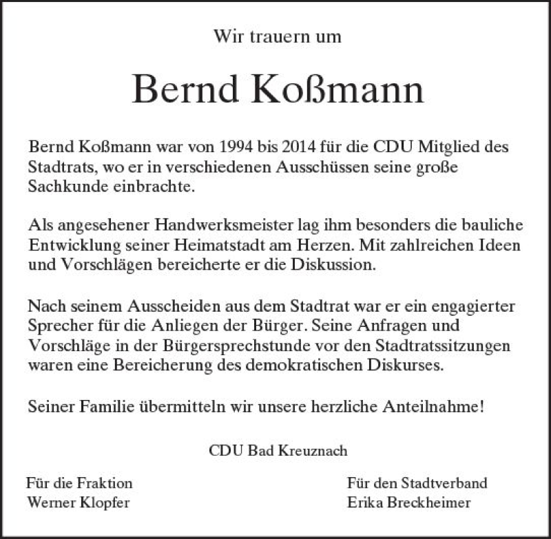 Hier finden Sie alle Traueranzeigen aus der Zeitung, die bisher für Bernd Koßmann erschienen sind. Weitere Traueranzeigen, die in der Zeitung erscheinen, werden hier ebenfalls aufgelistet
