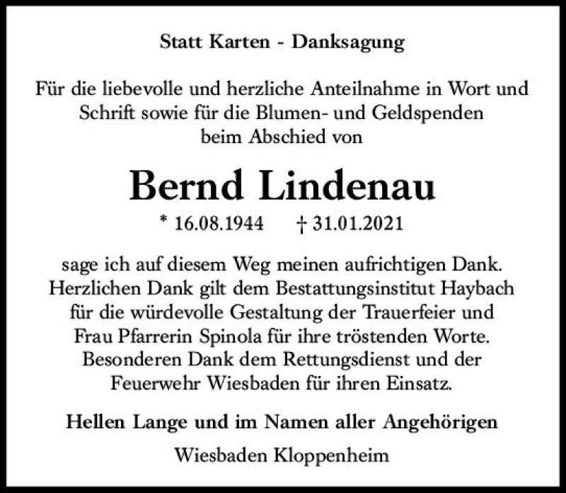Hier finden Sie alle Traueranzeigen aus der Zeitung, die bisher für Bernd Lindenau erschienen sind. Weitere Traueranzeigen, die in der Zeitung erscheinen, werden hier ebenfalls aufgelistet