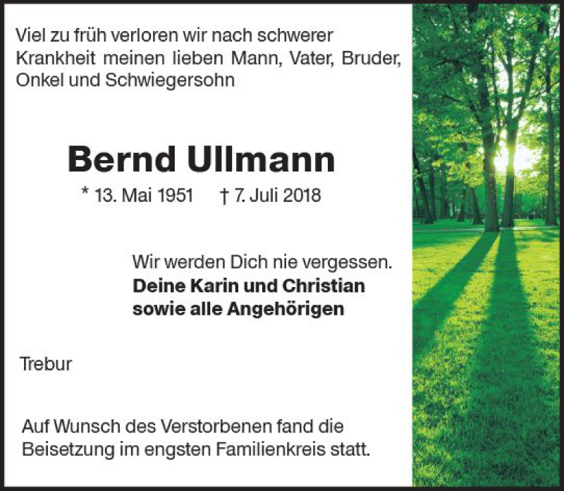 Hier finden Sie alle Traueranzeigen aus der Zeitung, die bisher für Bernd Ullmann erschienen sind. Weitere Traueranzeigen, die in der Zeitung erscheinen, werden hier ebenfalls aufgelistet