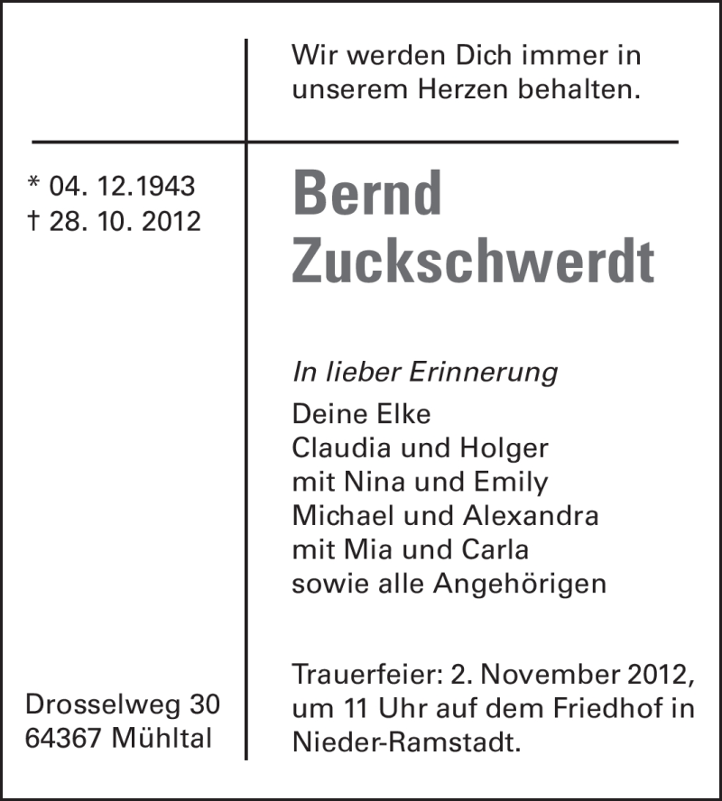 Hier finden Sie alle Traueranzeigen aus der Zeitung, die bisher für Bernd Zuckschwerdt erschienen sind. Weitere Traueranzeigen, die in der Zeitung erscheinen, werden hier ebenfalls aufgelistet