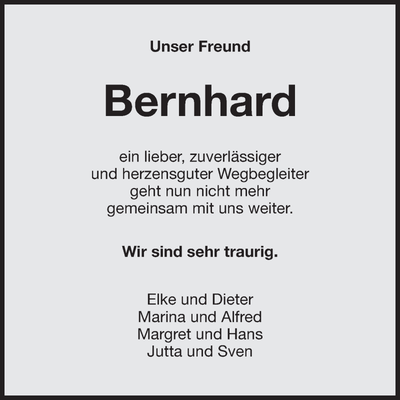 Hier finden Sie alle Traueranzeigen aus der Zeitung, die bisher für Bernhard erschienen sind. Weitere Traueranzeigen, die in der Zeitung erscheinen, werden hier ebenfalls aufgelistet