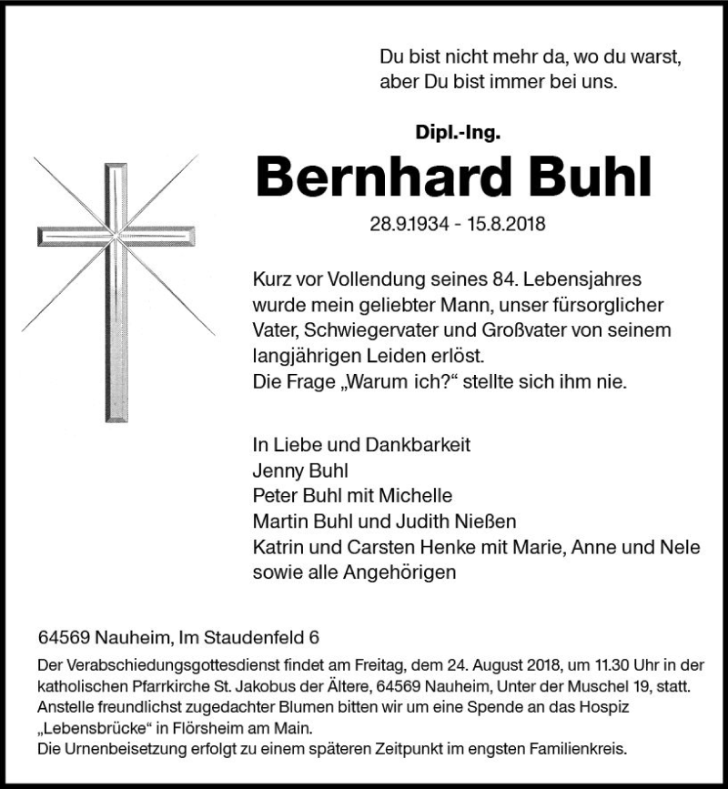 Hier finden Sie alle Traueranzeigen aus der Zeitung, die bisher für Bernhard Buhl erschienen sind. Weitere Traueranzeigen, die in der Zeitung erscheinen, werden hier ebenfalls aufgelistet