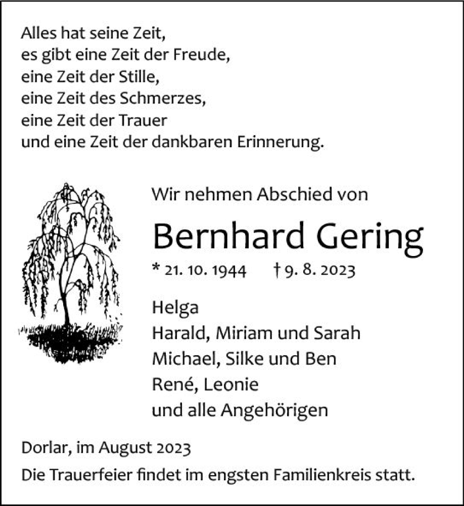 Hier finden Sie alle Traueranzeigen aus der Zeitung, die bisher für Bernhard Gering erschienen sind. Weitere Traueranzeigen, die in der Zeitung erscheinen, werden hier ebenfalls aufgelistet
