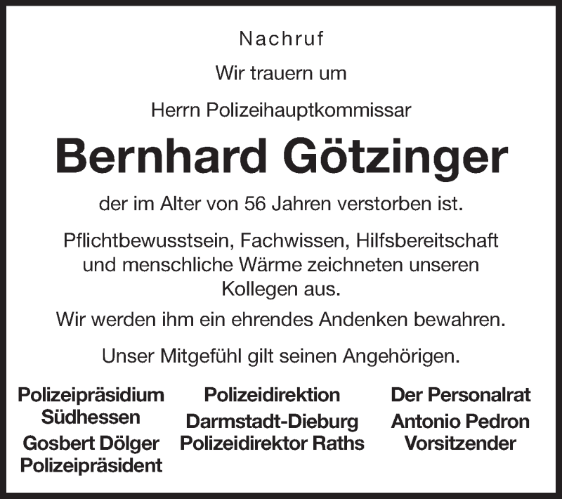 Hier finden Sie alle Traueranzeigen aus der Zeitung, die bisher für Bernhard Götzinger erschienen sind. Weitere Traueranzeigen, die in der Zeitung erscheinen, werden hier ebenfalls aufgelistet
