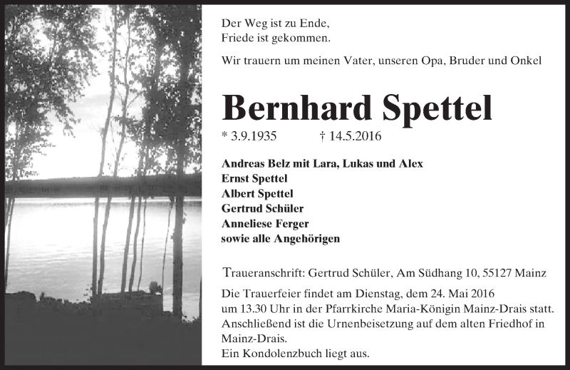Hier finden Sie alle Traueranzeigen aus der Zeitung, die bisher für Bernhard Spettel erschienen sind. Weitere Traueranzeigen, die in der Zeitung erscheinen, werden hier ebenfalls aufgelistet
