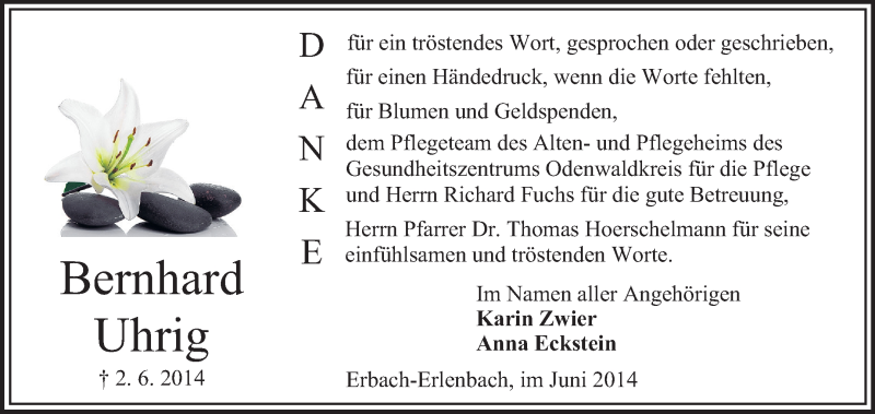 Hier finden Sie alle Traueranzeigen aus der Zeitung, die bisher für Bernhard Uhrig erschienen sind. Weitere Traueranzeigen, die in der Zeitung erscheinen, werden hier ebenfalls aufgelistet