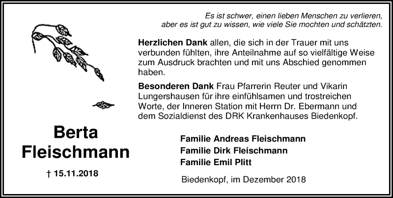 Hier finden Sie alle Traueranzeigen aus der Zeitung, die bisher für Berta Fleischmann erschienen sind. Weitere Traueranzeigen, die in der Zeitung erscheinen, werden hier ebenfalls aufgelistet