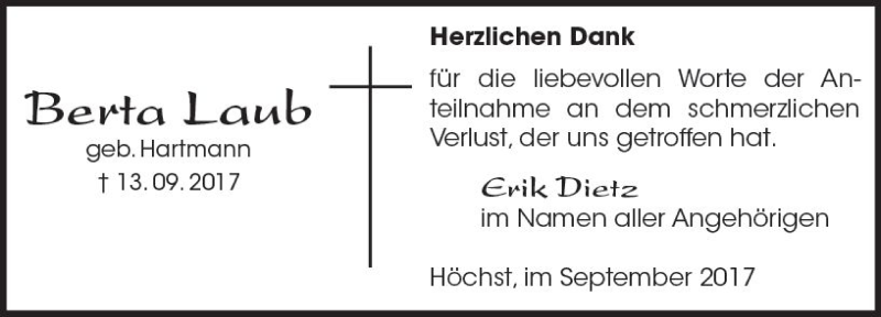 Hier finden Sie alle Traueranzeigen aus der Zeitung, die bisher für Berta Laub erschienen sind. Weitere Traueranzeigen, die in der Zeitung erscheinen, werden hier ebenfalls aufgelistet