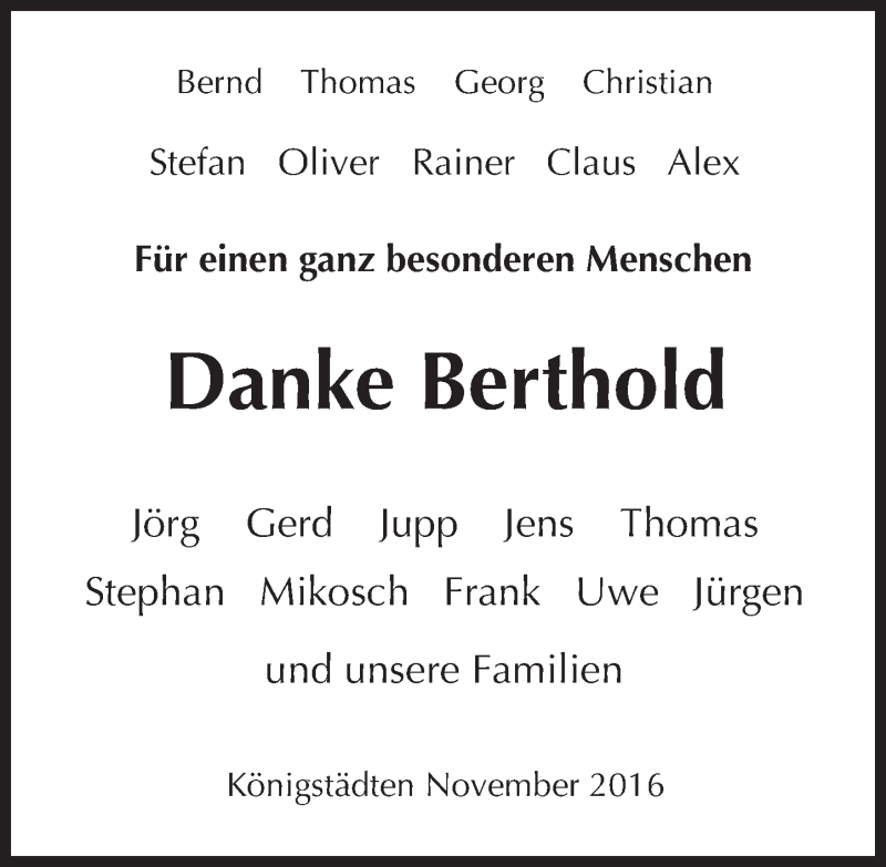 Hier finden Sie alle Traueranzeigen aus der Zeitung, die bisher für Berthold erschienen sind. Weitere Traueranzeigen, die in der Zeitung erscheinen, werden hier ebenfalls aufgelistet