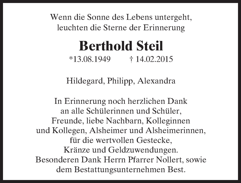 Hier finden Sie alle Traueranzeigen aus der Zeitung, die bisher für Berthold Steil erschienen sind. Weitere Traueranzeigen, die in der Zeitung erscheinen, werden hier ebenfalls aufgelistet