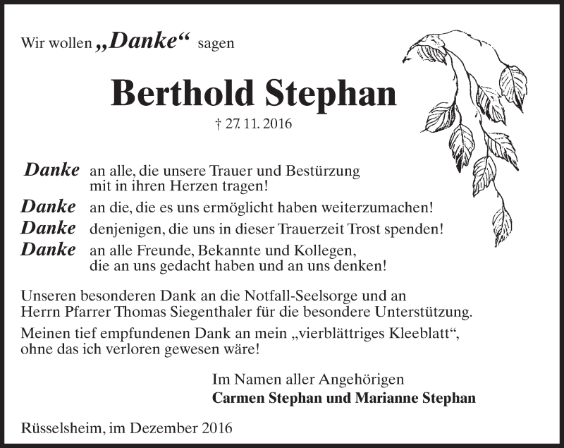 Hier finden Sie alle Traueranzeigen aus der Zeitung, die bisher für Berthold Stephan erschienen sind. Weitere Traueranzeigen, die in der Zeitung erscheinen, werden hier ebenfalls aufgelistet