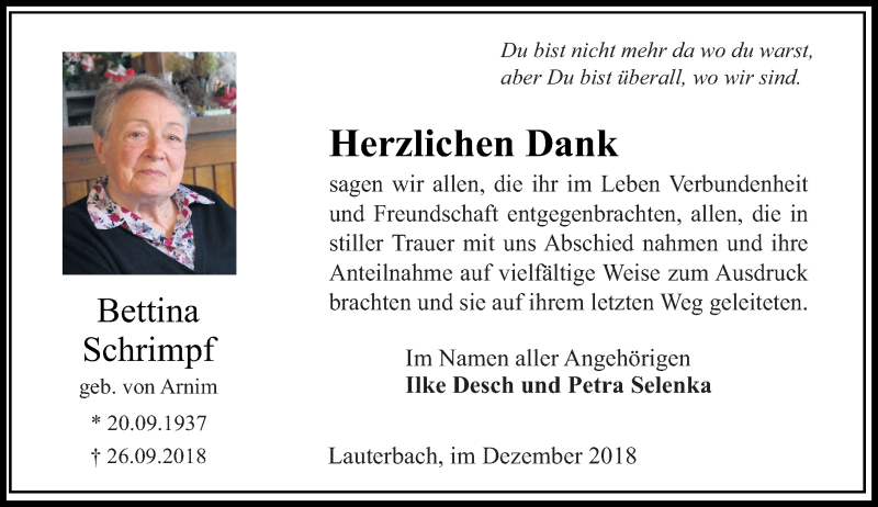 Hier finden Sie alle Traueranzeigen aus der Zeitung, die bisher für Bettina Schrimpf erschienen sind. Weitere Traueranzeigen, die in der Zeitung erscheinen, werden hier ebenfalls aufgelistet