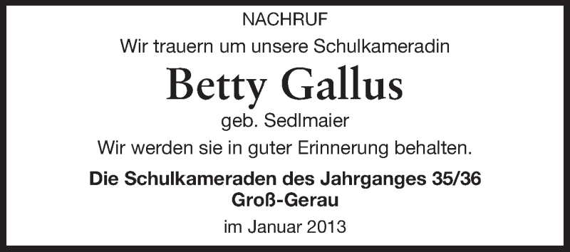 Hier finden Sie alle Traueranzeigen aus der Zeitung, die bisher für Betty Gallus erschienen sind. Weitere Traueranzeigen, die in der Zeitung erscheinen, werden hier ebenfalls aufgelistet