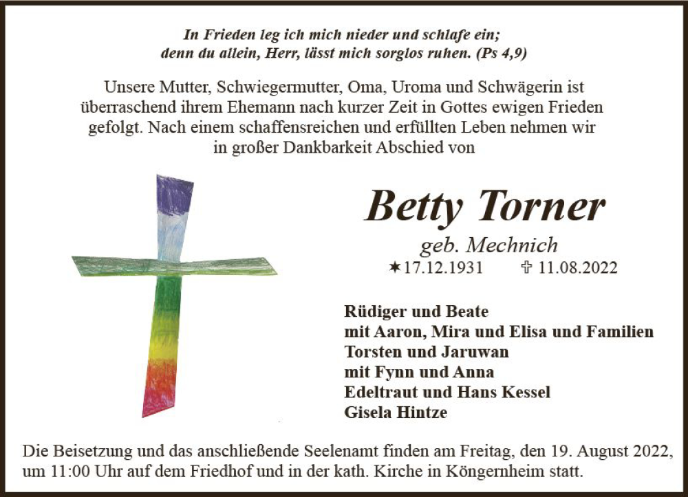 Hier finden Sie alle Traueranzeigen aus der Zeitung, die bisher für Betty Torner erschienen sind. Weitere Traueranzeigen, die in der Zeitung erscheinen, werden hier ebenfalls aufgelistet