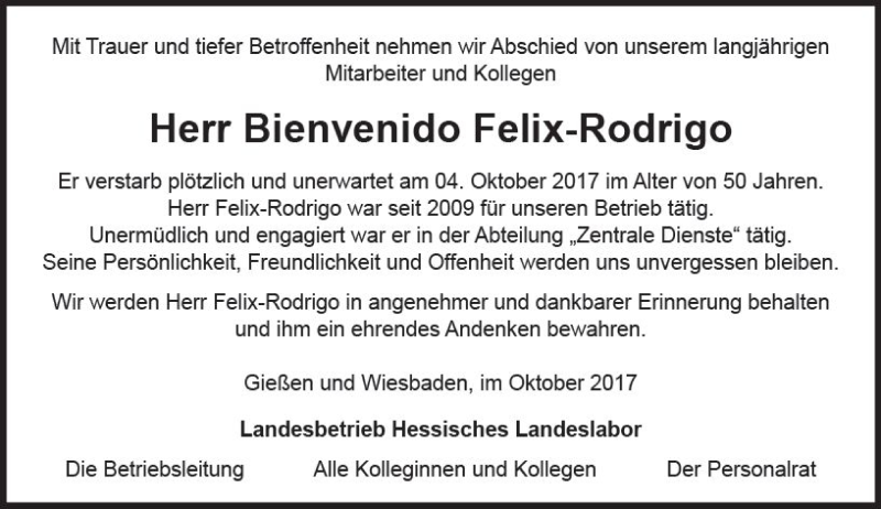 Hier finden Sie alle Traueranzeigen aus der Zeitung, die bisher für Bienvenido Felix-Rodrigo erschienen sind. Weitere Traueranzeigen, die in der Zeitung erscheinen, werden hier ebenfalls aufgelistet