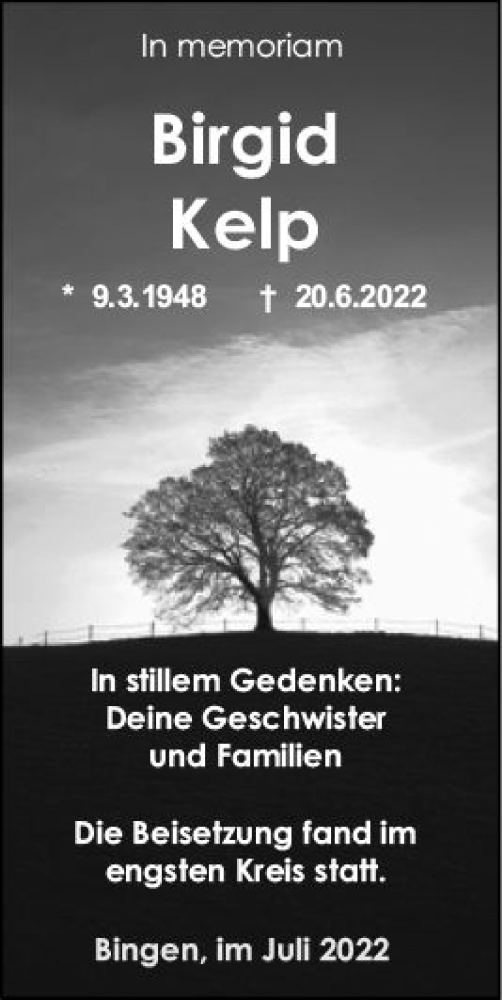 Hier finden Sie alle Traueranzeigen aus der Zeitung, die bisher für Birgid Kelp erschienen sind. Weitere Traueranzeigen, die in der Zeitung erscheinen, werden hier ebenfalls aufgelistet