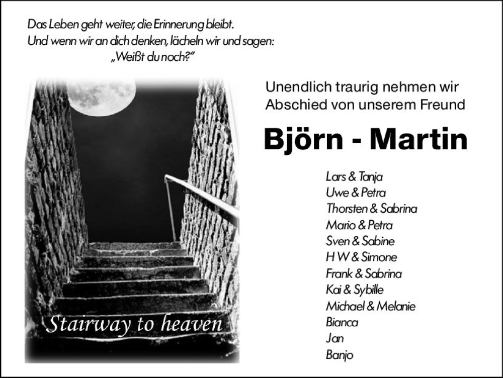 Hier finden Sie alle Traueranzeigen aus der Zeitung, die bisher für Björn-Martin erschienen sind. Weitere Traueranzeigen, die in der Zeitung erscheinen, werden hier ebenfalls aufgelistet