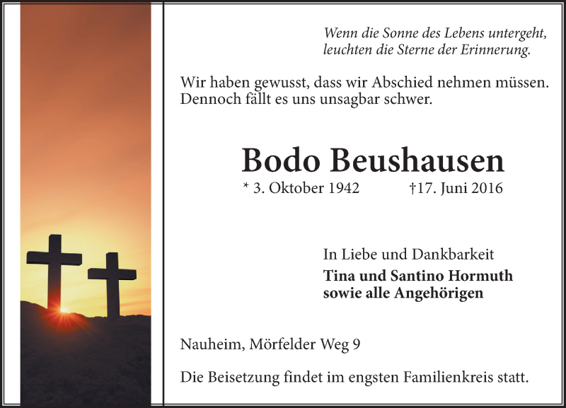 Hier finden Sie alle Traueranzeigen aus der Zeitung, die bisher für Bodo Beushausen erschienen sind. Weitere Traueranzeigen, die in der Zeitung erscheinen, werden hier ebenfalls aufgelistet