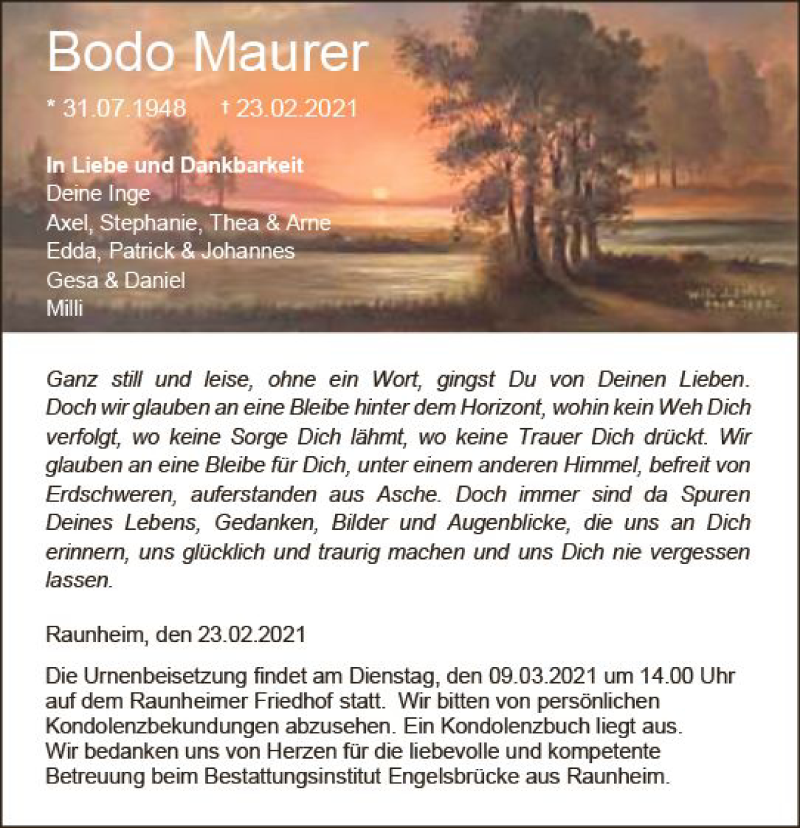 Hier finden Sie alle Traueranzeigen aus der Zeitung, die bisher für Bodo Maurer erschienen sind. Weitere Traueranzeigen, die in der Zeitung erscheinen, werden hier ebenfalls aufgelistet