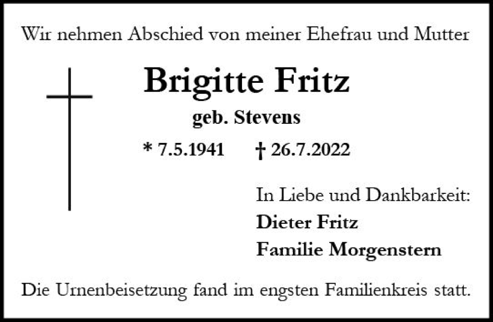 Hier finden Sie alle Traueranzeigen aus der Zeitung, die bisher für Brigitte Fritz erschienen sind. Weitere Traueranzeigen, die in der Zeitung erscheinen, werden hier ebenfalls aufgelistet