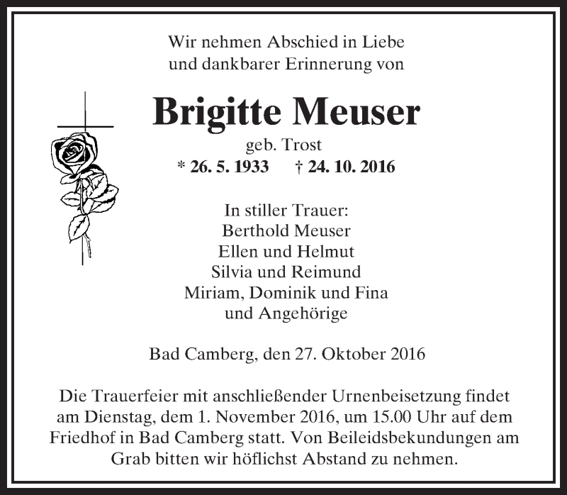 Hier finden Sie alle Traueranzeigen aus der Zeitung, die bisher für Brigitte Meuser erschienen sind. Weitere Traueranzeigen, die in der Zeitung erscheinen, werden hier ebenfalls aufgelistet