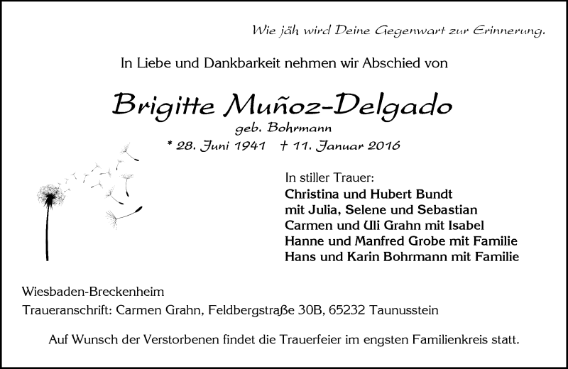 Hier finden Sie alle Traueranzeigen aus der Zeitung, die bisher für Brigitte Munoz-Delgado erschienen sind. Weitere Traueranzeigen, die in der Zeitung erscheinen, werden hier ebenfalls aufgelistet