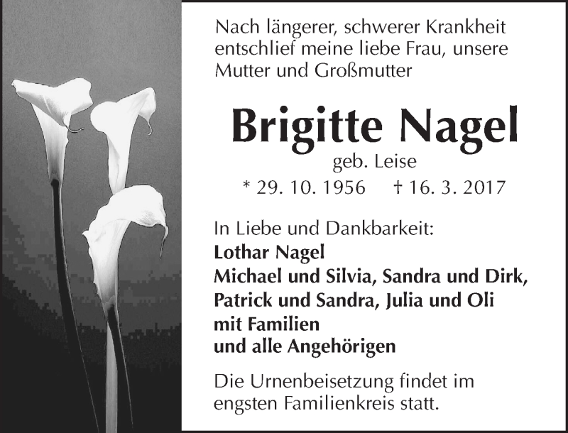 Hier finden Sie alle Traueranzeigen aus der Zeitung, die bisher für Brigitte Nagel erschienen sind. Weitere Traueranzeigen, die in der Zeitung erscheinen, werden hier ebenfalls aufgelistet