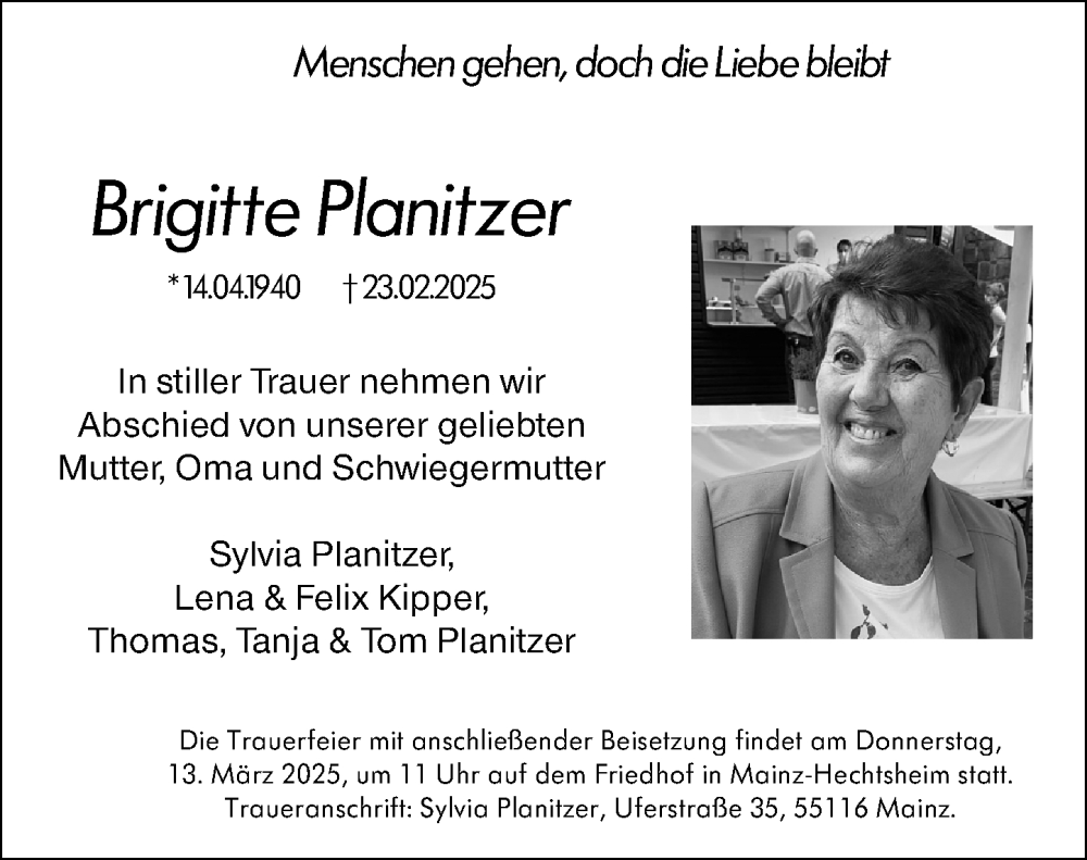 Hier finden Sie alle Traueranzeigen aus der Zeitung, die bisher für Brigitte Planitzer erschienen sind. Weitere Traueranzeigen, die in der Zeitung erscheinen, werden hier ebenfalls aufgelistet
