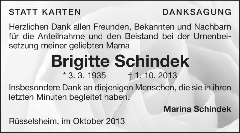 Hier finden Sie alle Traueranzeigen aus der Zeitung, die bisher für Brigitte Schindek erschienen sind. Weitere Traueranzeigen, die in der Zeitung erscheinen, werden hier ebenfalls aufgelistet