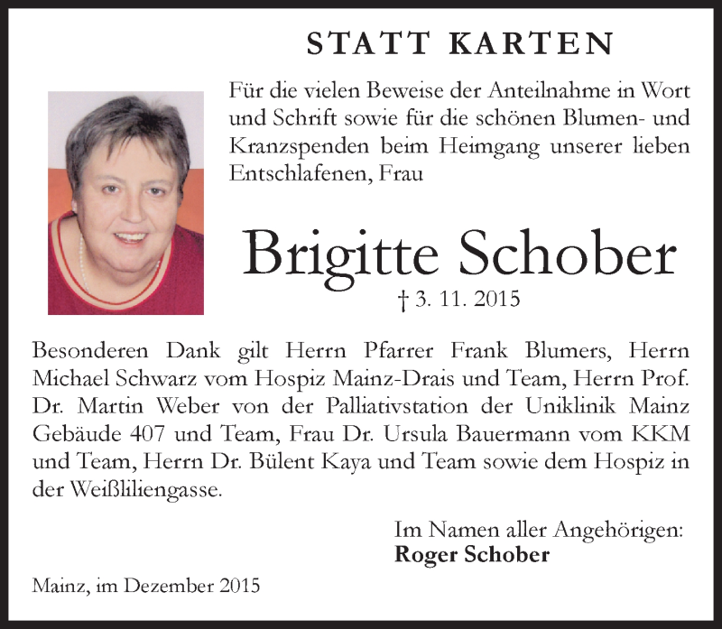 Hier finden Sie alle Traueranzeigen aus der Zeitung, die bisher für Brigitte Schober erschienen sind. Weitere Traueranzeigen, die in der Zeitung erscheinen, werden hier ebenfalls aufgelistet