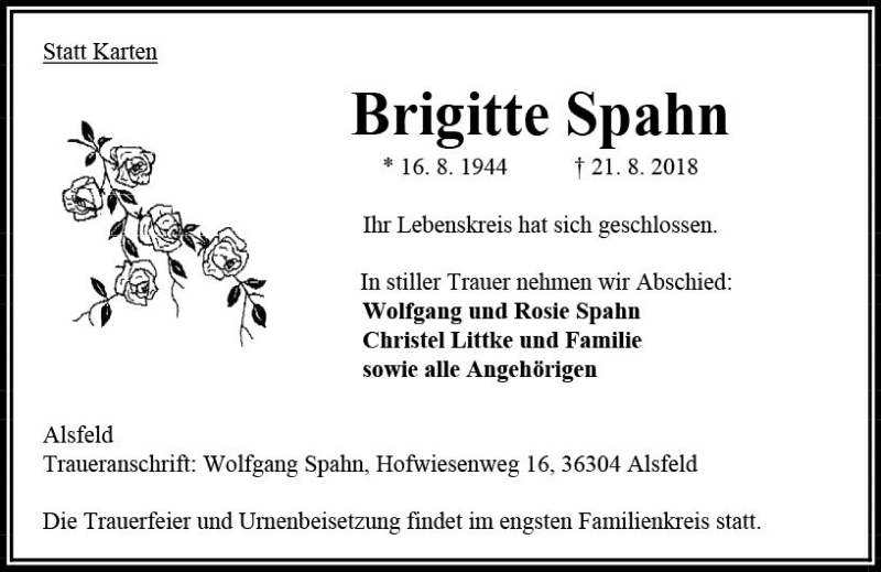 Hier finden Sie alle Traueranzeigen aus der Zeitung, die bisher für Brigitte Spahn erschienen sind. Weitere Traueranzeigen, die in der Zeitung erscheinen, werden hier ebenfalls aufgelistet