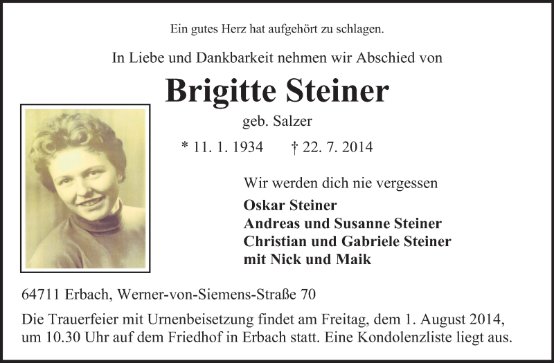 Hier finden Sie alle Traueranzeigen aus der Zeitung, die bisher für Brigitte Steiner erschienen sind. Weitere Traueranzeigen, die in der Zeitung erscheinen, werden hier ebenfalls aufgelistet