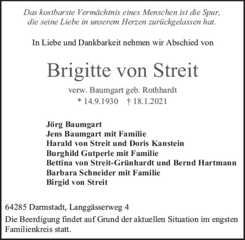 Hier finden Sie alle Traueranzeigen aus der Zeitung, die bisher für Brigitte von Streit erschienen sind. Weitere Traueranzeigen, die in der Zeitung erscheinen, werden hier ebenfalls aufgelistet