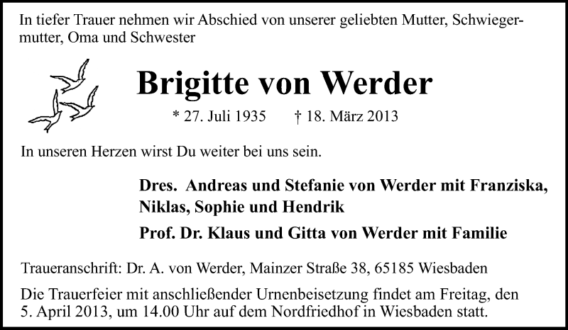 Hier finden Sie alle Traueranzeigen aus der Zeitung, die bisher für Brigitte von Werder erschienen sind. Weitere Traueranzeigen, die in der Zeitung erscheinen, werden hier ebenfalls aufgelistet