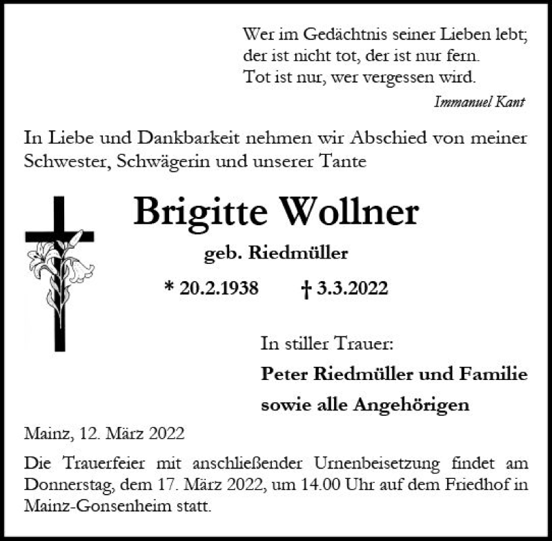 Hier finden Sie alle Traueranzeigen aus der Zeitung, die bisher für Brigitte Wollner erschienen sind. Weitere Traueranzeigen, die in der Zeitung erscheinen, werden hier ebenfalls aufgelistet