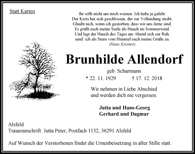 Hier finden Sie alle Traueranzeigen aus der Zeitung, die bisher für Brunhilde Allendorf erschienen sind. Weitere Traueranzeigen, die in der Zeitung erscheinen, werden hier ebenfalls aufgelistet