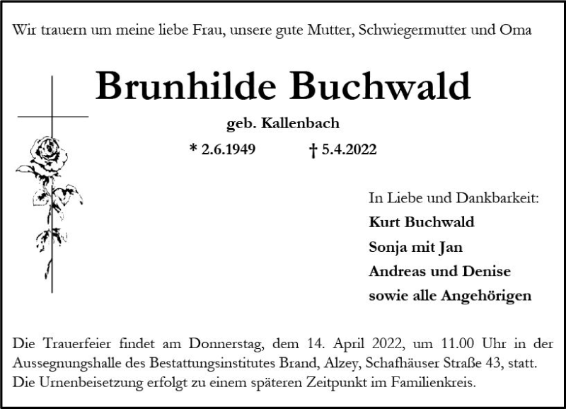 Hier finden Sie alle Traueranzeigen aus der Zeitung, die bisher für Brunhilde Buchwald erschienen sind. Weitere Traueranzeigen, die in der Zeitung erscheinen, werden hier ebenfalls aufgelistet