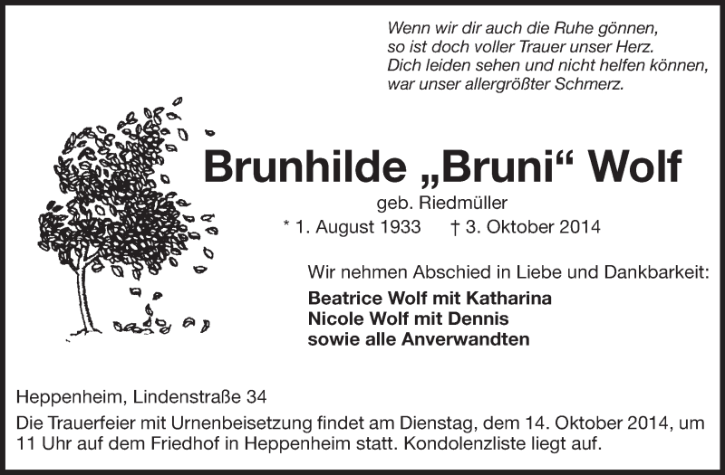Hier finden Sie alle Traueranzeigen aus der Zeitung, die bisher für Brunhilde Wolf erschienen sind. Weitere Traueranzeigen, die in der Zeitung erscheinen, werden hier ebenfalls aufgelistet