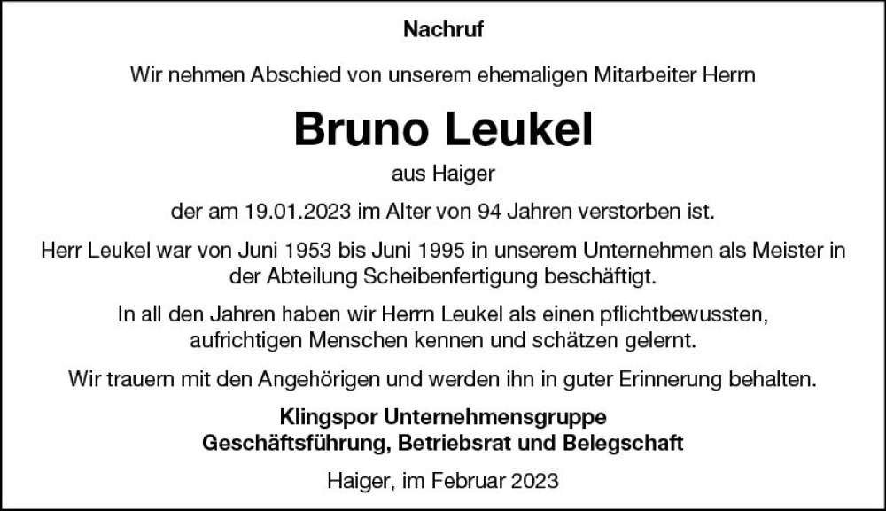 Hier finden Sie alle Traueranzeigen aus der Zeitung, die bisher für Bruno Leukel erschienen sind. Weitere Traueranzeigen, die in der Zeitung erscheinen, werden hier ebenfalls aufgelistet