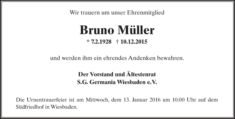 Hier finden Sie alle Traueranzeigen aus der Zeitung, die bisher für Bruno Müller erschienen sind. Weitere Traueranzeigen, die in der Zeitung erscheinen, werden hier ebenfalls aufgelistet