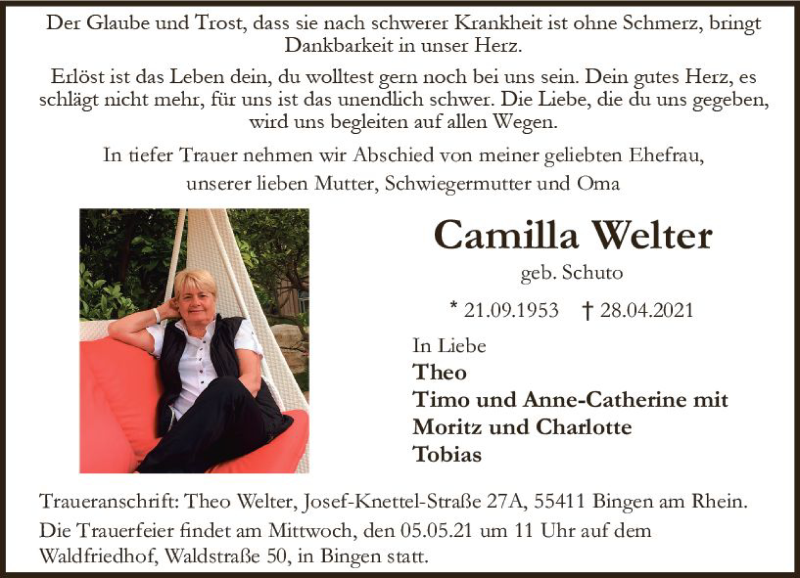 Hier finden Sie alle Traueranzeigen aus der Zeitung, die bisher für Camilla Welter erschienen sind. Weitere Traueranzeigen, die in der Zeitung erscheinen, werden hier ebenfalls aufgelistet