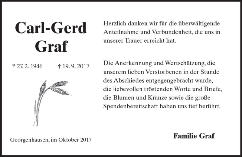 Hier finden Sie alle Traueranzeigen aus der Zeitung, die bisher für Carl-Gerd Graf erschienen sind. Weitere Traueranzeigen, die in der Zeitung erscheinen, werden hier ebenfalls aufgelistet