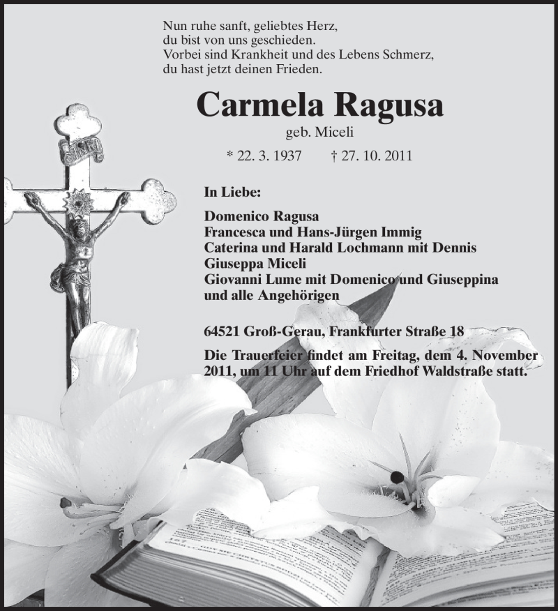 Hier finden Sie alle Traueranzeigen aus der Zeitung, die bisher für Carmela Ragusa erschienen sind. Weitere Traueranzeigen, die in der Zeitung erscheinen, werden hier ebenfalls aufgelistet